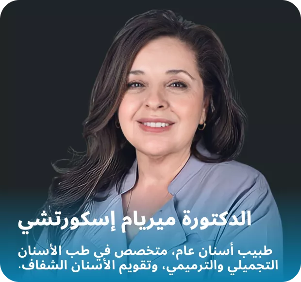 الدكتورة ميريام إسكورتشي طبيبة أسنان عامة متخصصة في طب الأسنان التجميلي والترميمي، حاصلة على شهادة في جراحة الأسنان من جامعة فنزويلا المركزية. تتمتع بخبرة واسعة في جراحة الفم، وطب أسنان الأطفال، وعلاج أمراض اللثة، والترميمات التجميلية، وهي ملتزمة بتقديم رعاية دقيقة تركز على المريض. تتقن الدكتورة ميريام اللغتين الإنجليزية والإسبانية، وتجمع بين المهارة الفنية والتميز السريري في علاجات مثل تبييض الأسنان، والحشوات التجميلية، وخلع الأسنان، وطب الأسنان الترميمي. إن نهجها الإنساني واهتمامها بالتفاصيل يجعلانها خيارًا موثوقًا به للمرضى الذين يسعون للحصول على ابتسامة واثقة وطبيعية المظهر في دبي.